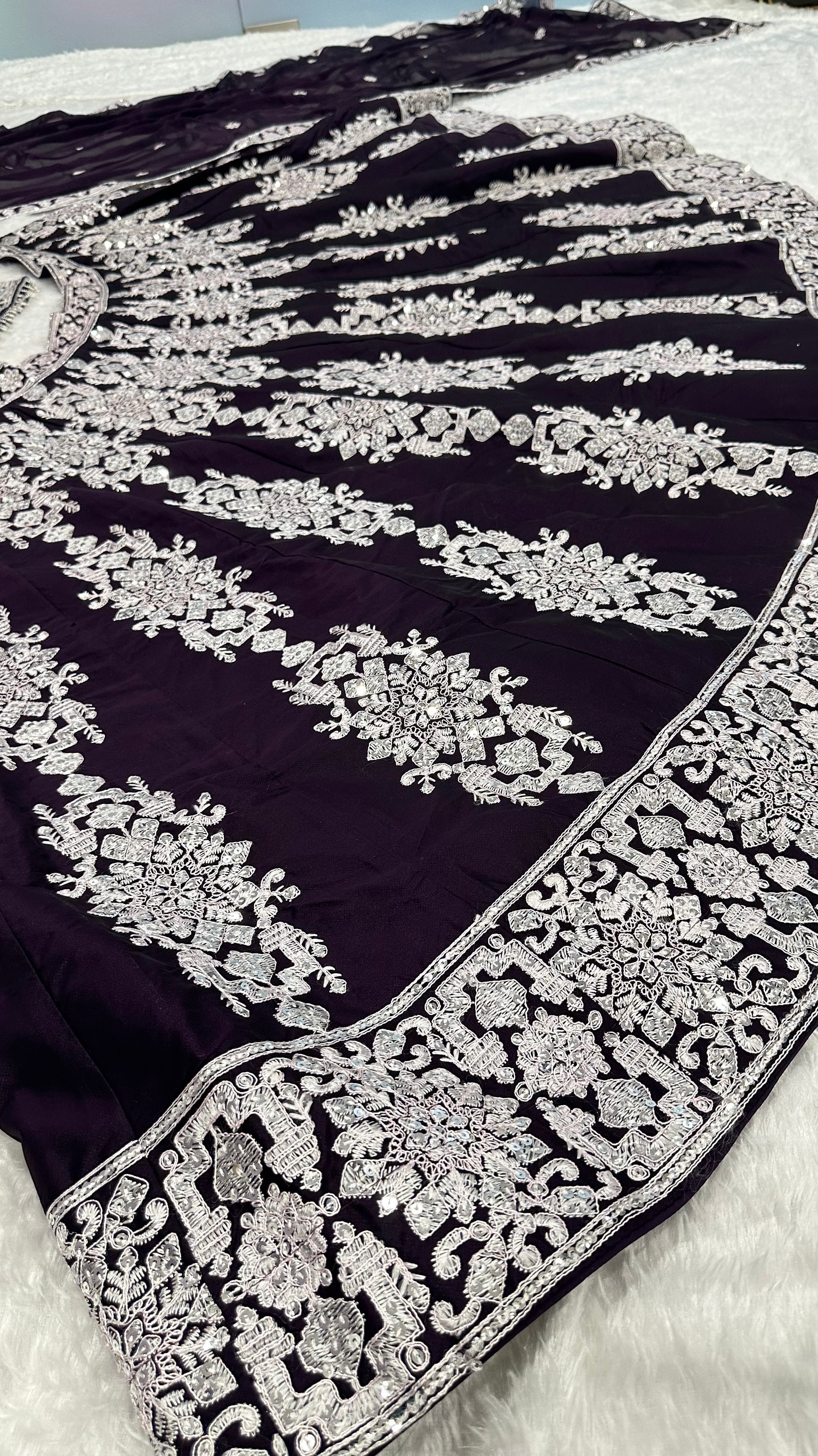 Completing this royal ensemble is a delicate net dupatta, gracefully adorned with coordinating sequins, thread, and Dori work. Its sheer elegance adds a final touch of sophistication, ensuring you radiate an aura of majestic charm.
