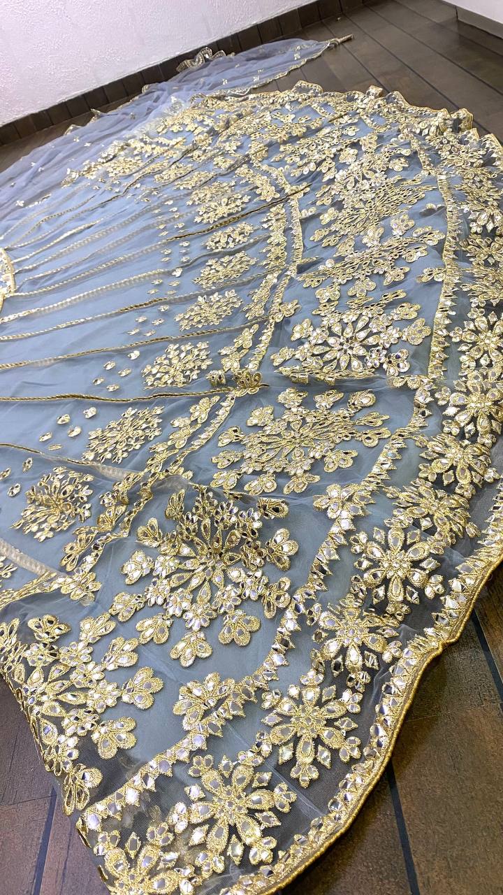 Completing this royal ensemble is a delicate net dupatta, gracefully adorned with coordinating sequins, thread, and Dori work. Its sheer elegance adds a final touch of sophistication, ensuring you radiate an aura of majestic charm.